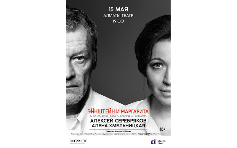 15 мая в 19:00 на сцене Almaty Theatre состоится показ спектакля «Эйнштейн и Маргарита», в котором впервые выступят дуэтом Алёна Хмельницкая и Александр Серебряков.